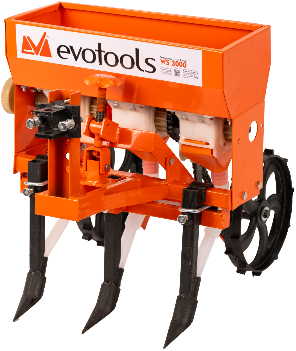 The Three-Row Seeder WS3000 for EvoTools® tiller is specialized equipment for sowing agricultural or horticultural crops. Designed to be attached to the tiller, this seeder can simultaneously sow three rows of seeds. Through its advanced system, it ensures uniform seed distribution across the field, thereby optimizing the seeding process and helping achieve a rich, uniform harvest. Easy to install and use, the WS3000 seeder is an efficient and practical solution for any farmer or gardener. Specifications: Dimensions: 670 x 600 x 600 mm Number of rows: 3 Maximum width: 50 cm Row spacing: 14-17 cm Depth: 2-10 cm Seed hopper capacity: 6 kg Weight: 22 kg Output: ~1500 mp/h Wheel diameter: 30 cm WARNING! For your safety, read the manual and general safety instructions carefully before using the equipment. Failure to follow these rules may result in incidents and/or personal injury. Keep the manual for future reference.